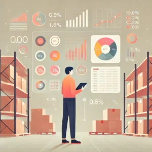 Portada » Introduciendo WMS » DALL·E 2024-09-17 12.54.52 – A person standing in a warehouse or storage facility in a flat, minimalistic style with warm pastel colors. The person is holding a tablet or clipboar